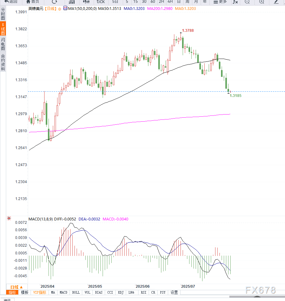 “英国经济目前面临双重压力:服务业增长乏力与工资增长趋缓,使得英国央行被迫转向更宽松的货币政策立场,”一位利率策略师在分析报告中写道。 与此同时,美元方面则受到新的政策提振。美国总统特朗普签署行政令,将全球最低关税水平设定为10%,同时将对加拿大的进口商品关税由25%上调至35%,并延长对墨西哥的关税安排90天以争取更多谈判时间。 这一举动使得市场对美元避险需求增强,从而推动美元指数走强。 目前市场焦点转向美国即将公布的7月非农就业数据(NFP)。预期数据显示,美国新增就业岗位可能下降至11万人,失业率或升至4.2%。若数据不及预期,美元可能短线回调,给英镑带来一定修复机会。 日线图上,GBP/USD已跌破短期支撑位1.3220,当前测试1.3180-1.3190区域。若失守该位,下方关注关键支撑位1.3140与50日均线附近1.3085。上方阻力位仍在1.3250与1.3300区域,短线反弹空间受限,需美数据配合。 技术指标方面,RSI位于45一线,未明显超卖,但动能指标趋于下行,暗示仍有回调空间;MACD死叉未解,短线偏空结构维持。