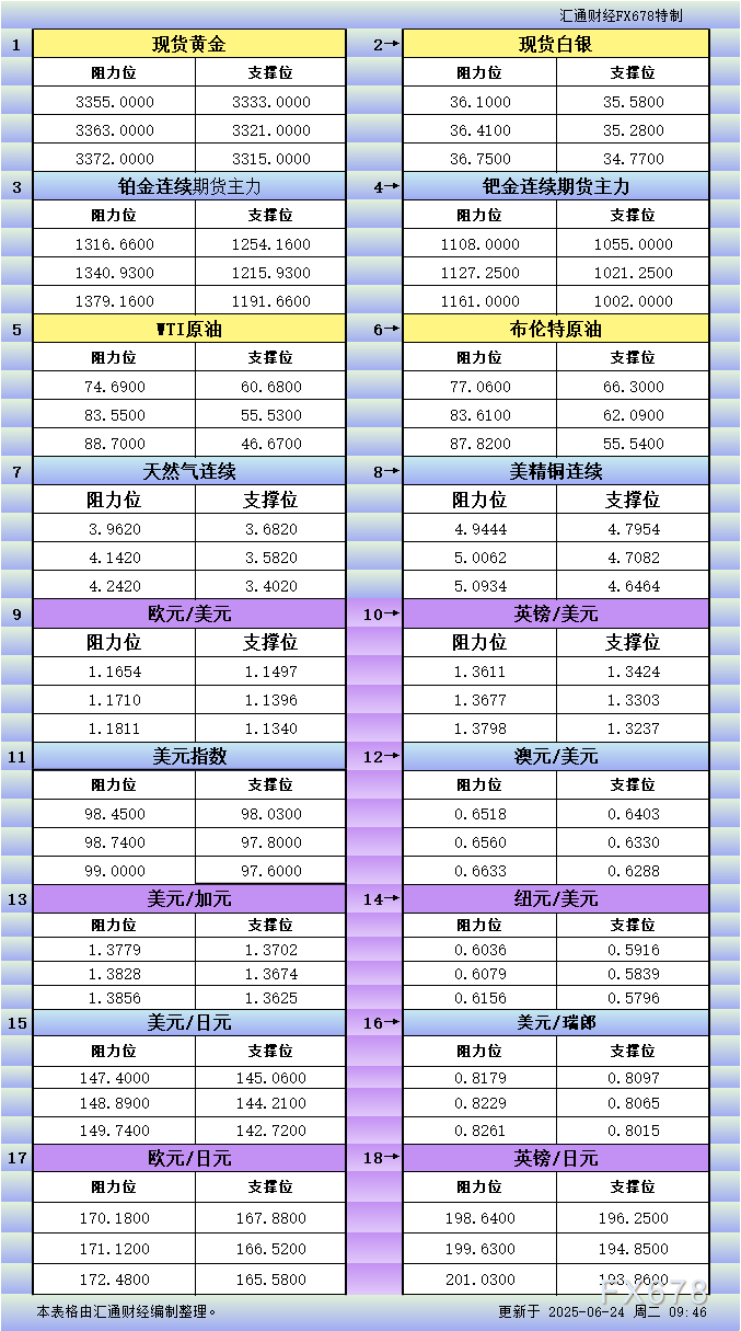 XM官网6月24日亚市更新支撑阻力:18品种支撑阻力(金银铂钯原油天然气铜及十大