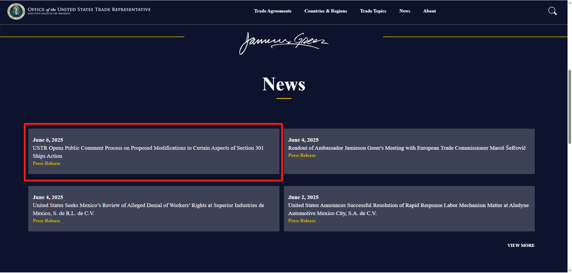 美国贸易代表办公室近日就船舶行动拟议修改方案启动了公众意见征询程序,根据其发布的文件显示,该...